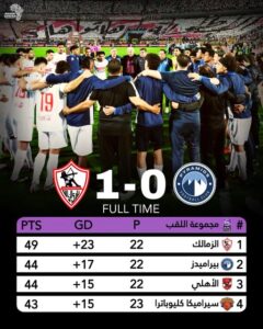 بهذا الانتصار، رفع الزمالك رصيده إلى 49 نقطة في صدارة الترتيب، بينما تجمد رصيد بيراميدز عند 44 نقطة في المركز الثاني، وهو نفس رصيد الأهلي في المركز الثالث، لتشتعل المنافسة على اللقب.