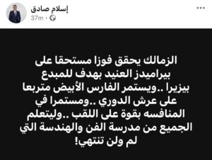 وكتب إسلام صادق عبر حسابه على موقع “فيسبوك” أن الزمالك حقق فوزاً مستحقاً على بيراميدز “العنيد” بهدف للاعب المميز خوان بيزيرا، مؤكداً استمرار الفريق الأبيض في تقديم أداء قوي خلال سباق المنافسة على اللقب.