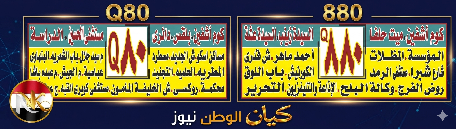خط Q80: يمتد من كوم أشفين مرورًا بعدد من المناطق الحيوية وصولًا إلى القاهرة، ومنها المطرية وروكسي والعباسية والدراسة.