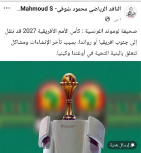 تتجه أنظار الاتحاد الأفريقي لكرة القدم الاتحاد الأفريقي لكرة القدم إلى إعادة تقييم ملف استضافة كأس الأمم الأفريقية 2027، وسط تقارير تشير إلى احتمال سحب التنظيم من الدول الثلاث المضيفة: أوغندا وكينيا وتنزانيا، بسبب تأخر أعمال البنية التحتية.