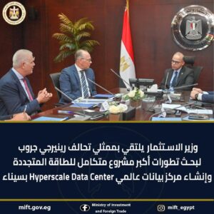 جاء ذلك خلال لقاء الوزير مع ممثلي تحالف “رينرجي جروب”، حيث تم بحث تطورات تنفيذ مشروع متكامل لإنتاج الطاقة الخضراء، يشمل الهيدروجين الأخضر والطاقة الشمسية وبطاريات تخزين الطاقة، إلى جانب مناقشة مقترح إنشاء مركز بيانات عالمي (Hyperscale Data Center).